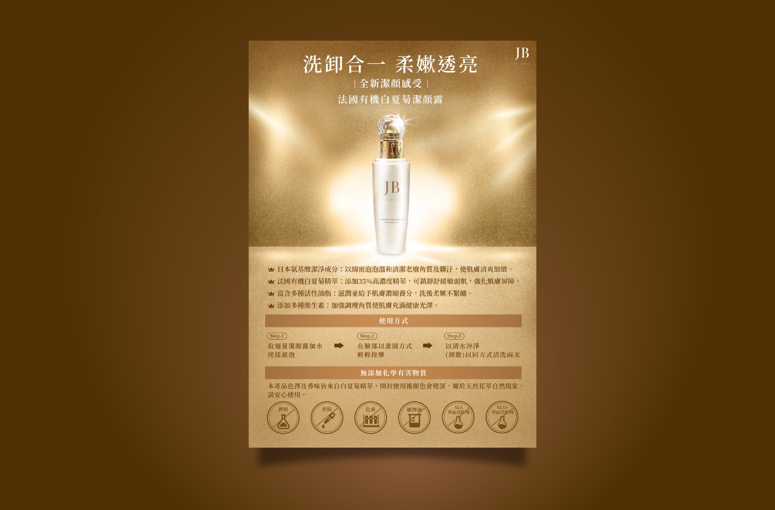 使用金色畫面展現產品包裝的華麗,整體為金棕色,下方使用icon展現無添加項目。