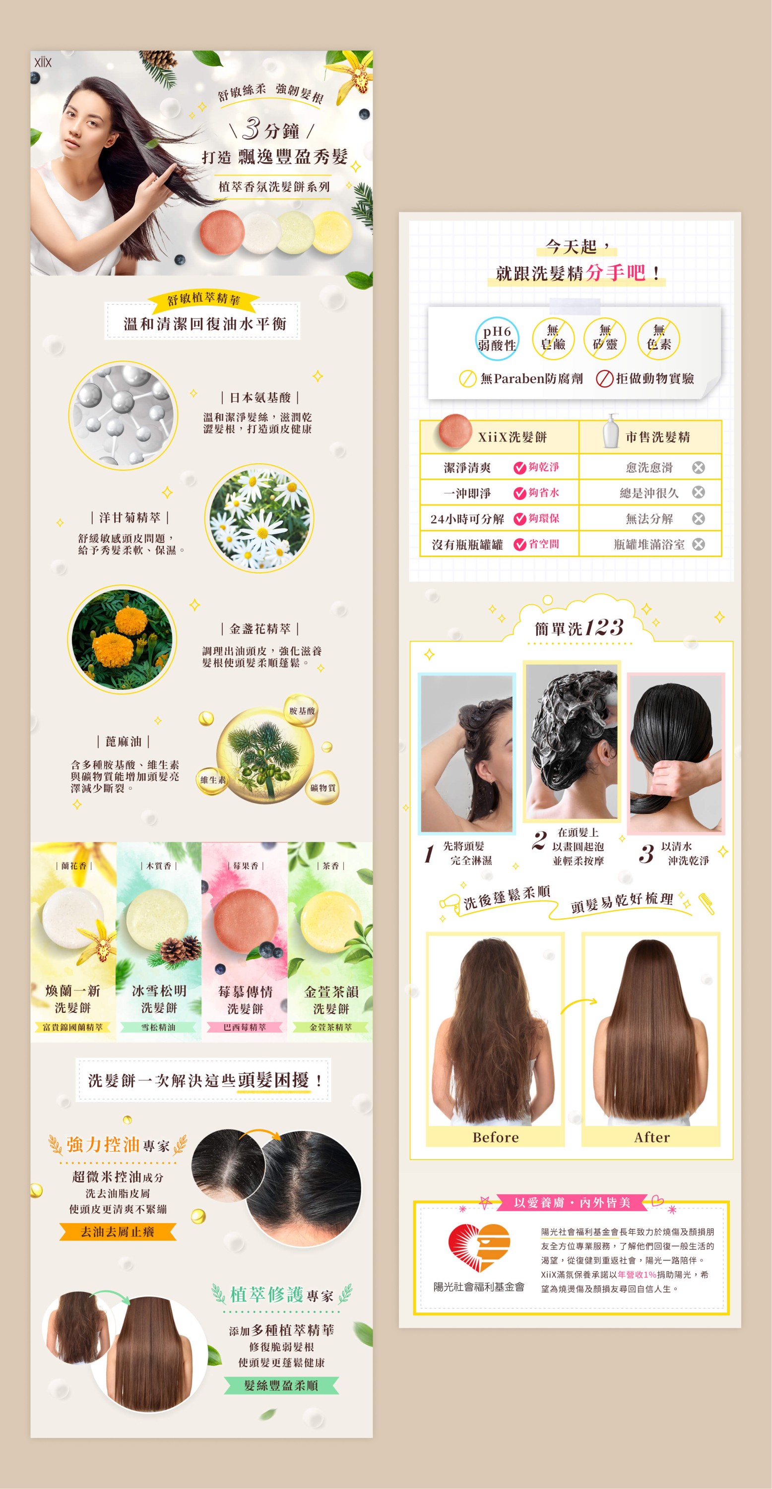 XiiX為創新的洗髮餅品牌,希望呈現的擁有植萃精華的洗髮產品,我編排時使用多種天然素材並加入許多俏皮的插畫元素,來展現此品牌的創新時尚。