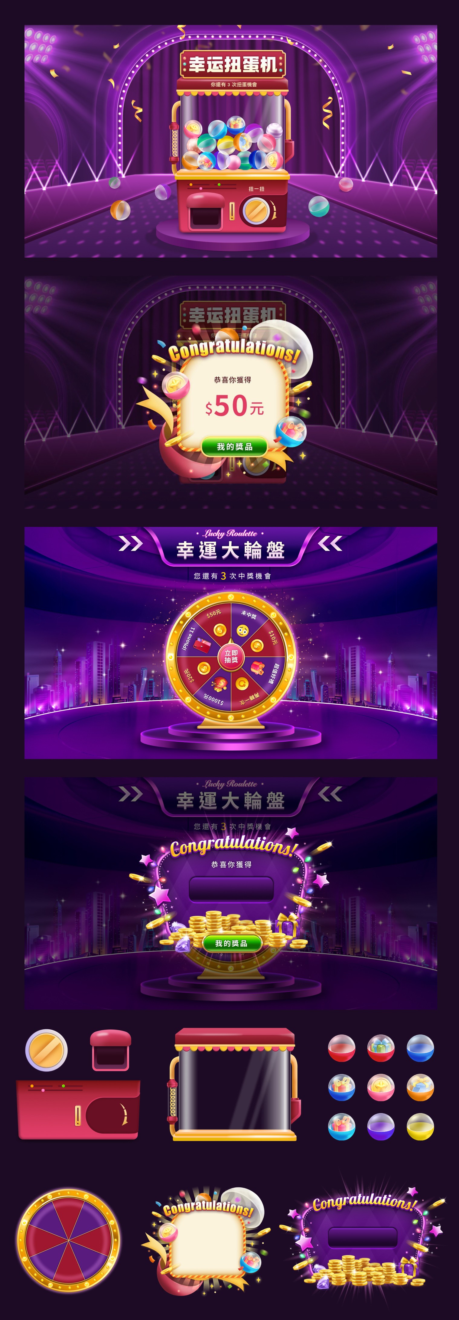 兩款網頁抽獎遊戲,提供給會員進行不同的抽選體驗,第一款是扭蛋的方式,點選按鈕後觸發扭蛋動畫,扭蛋釣出後彈出中獎彈窗,輪盤也是差不多概念,主要負責整體視覺以及企劃概念。